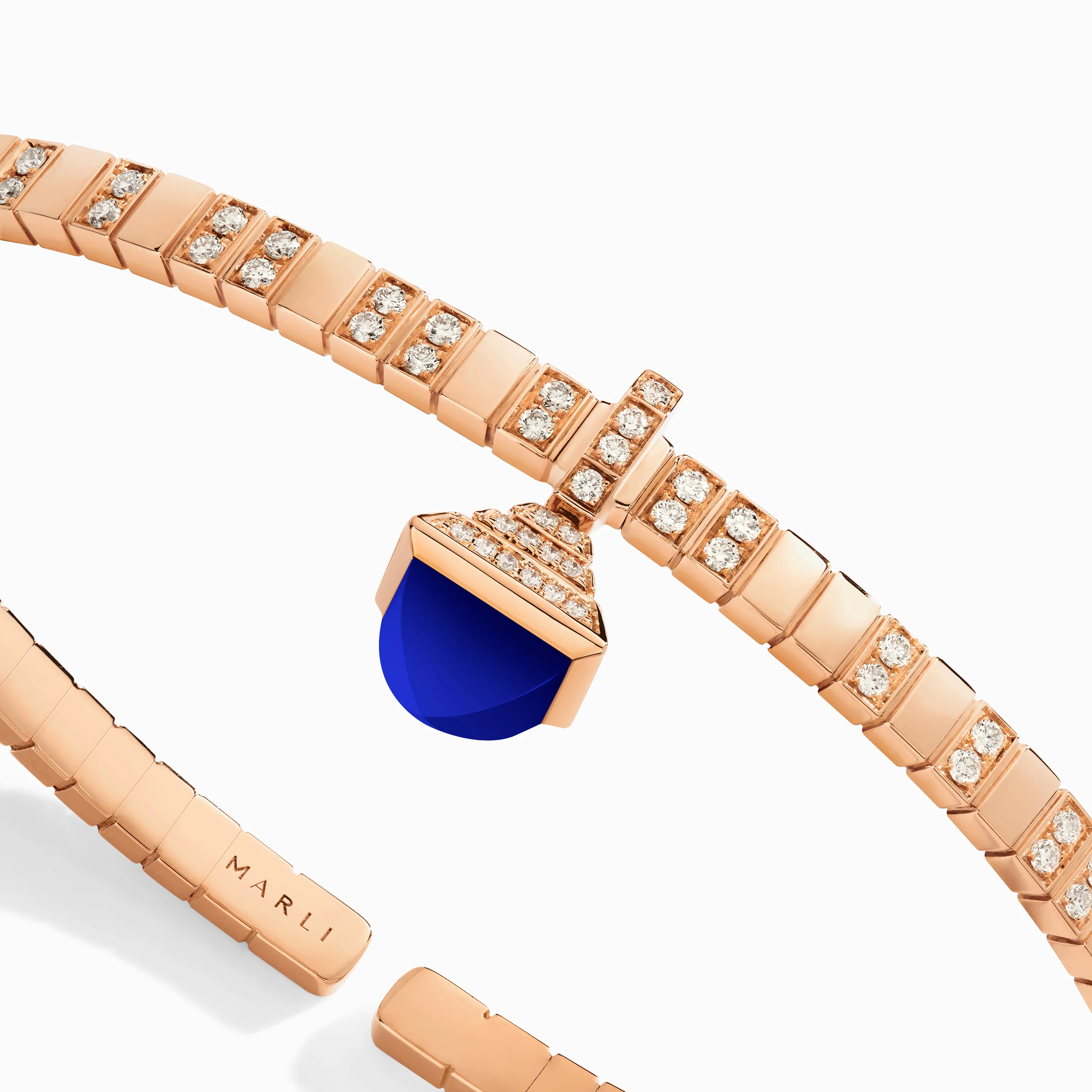 This uniquely embellished bracelet design features graphic lines and illuminating diamonds with precious gemstones of your choice linked with Cleo Charms to create a striking look encapsulating the radiancy and strength of all women.