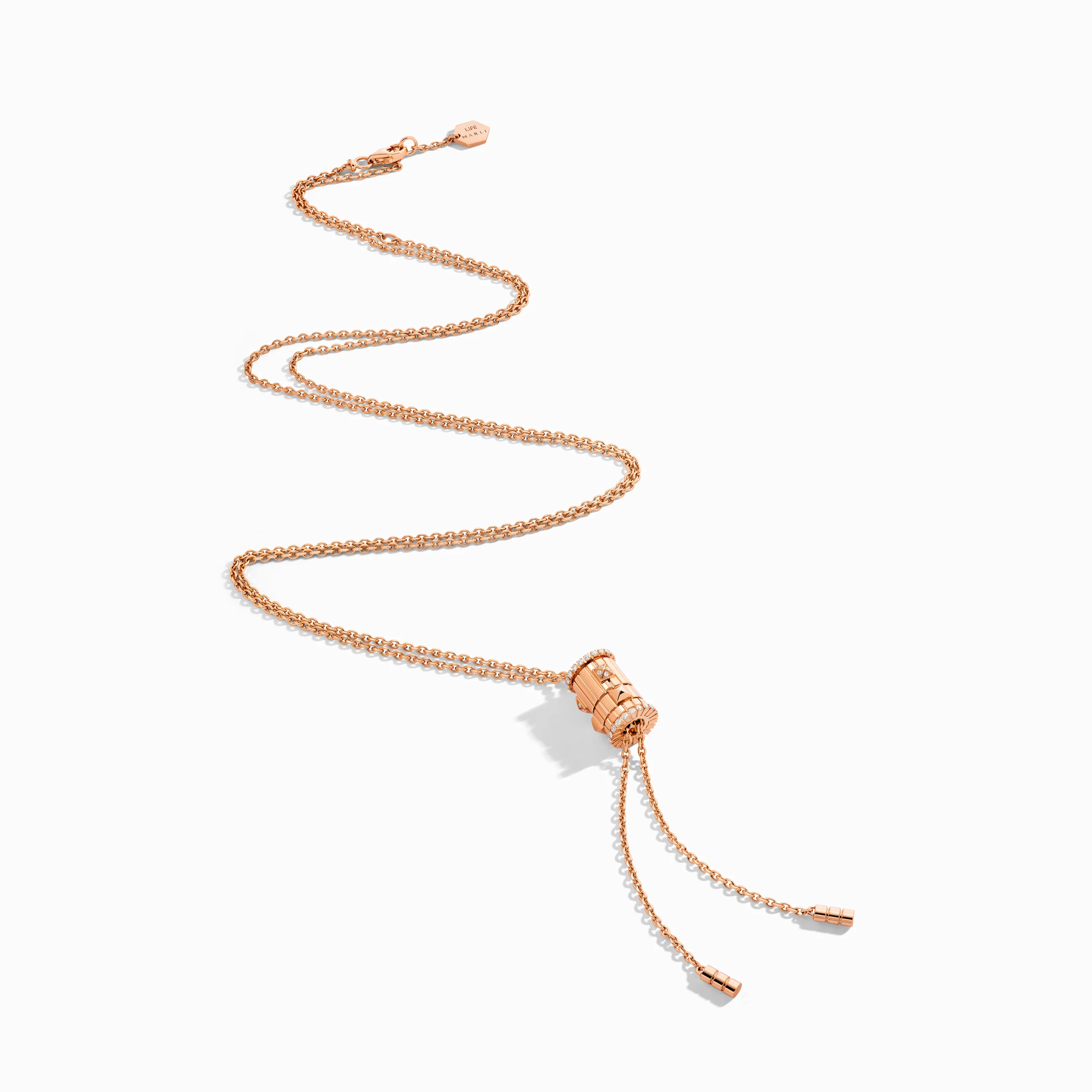 This cravat-style necklace showcases a rotating pendant, mirroring the kinetic charm of the collection's signature ring design, while also granting the wearer the freedom to adjust the length to suit their unique style and occasion.