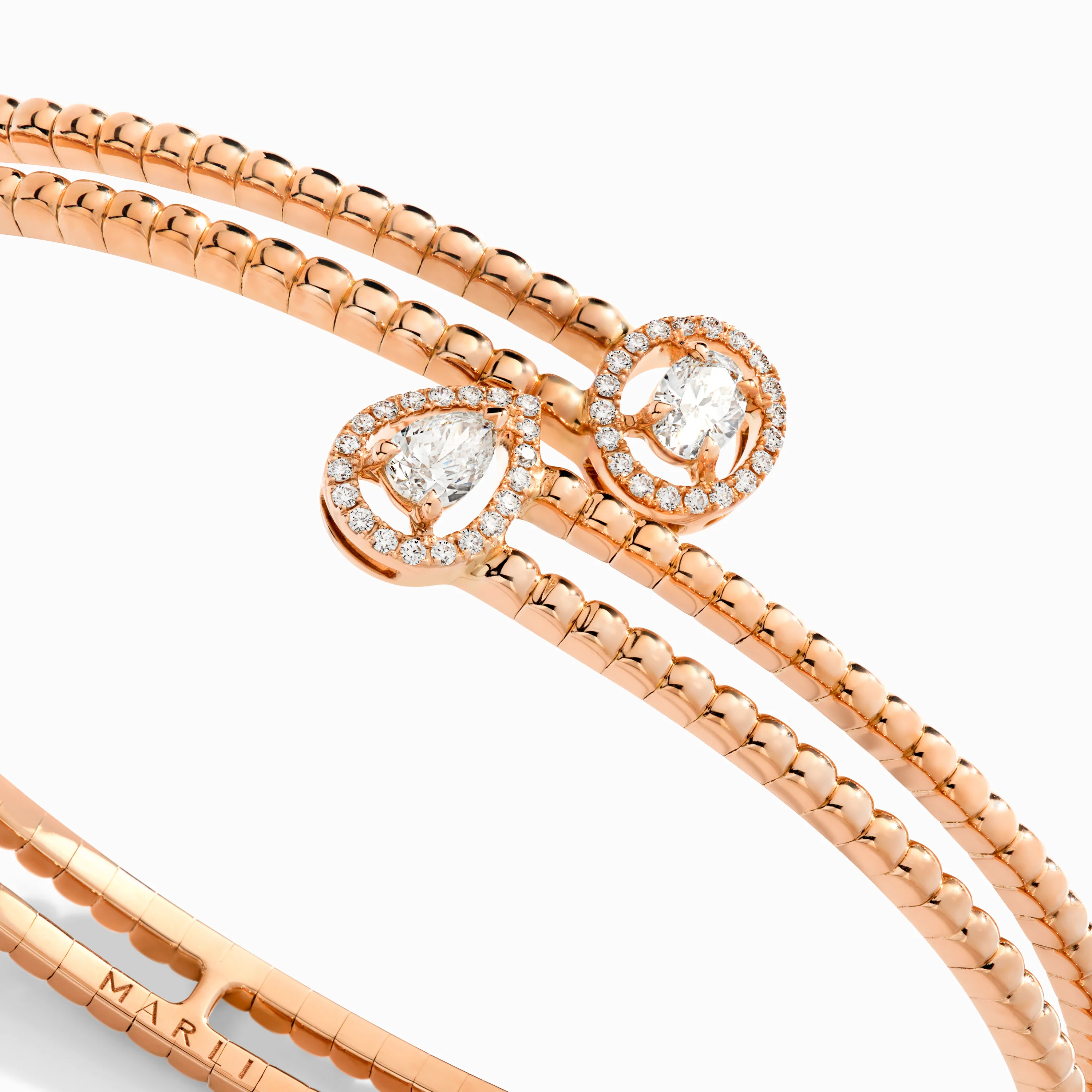 With an aesthetically sculpted embellished design in 18K gold, this multi-shaped bypass diamond bracelet, featuring a pear shape diamond and a round brilliant cut diamond, evokes imaginative spirit.