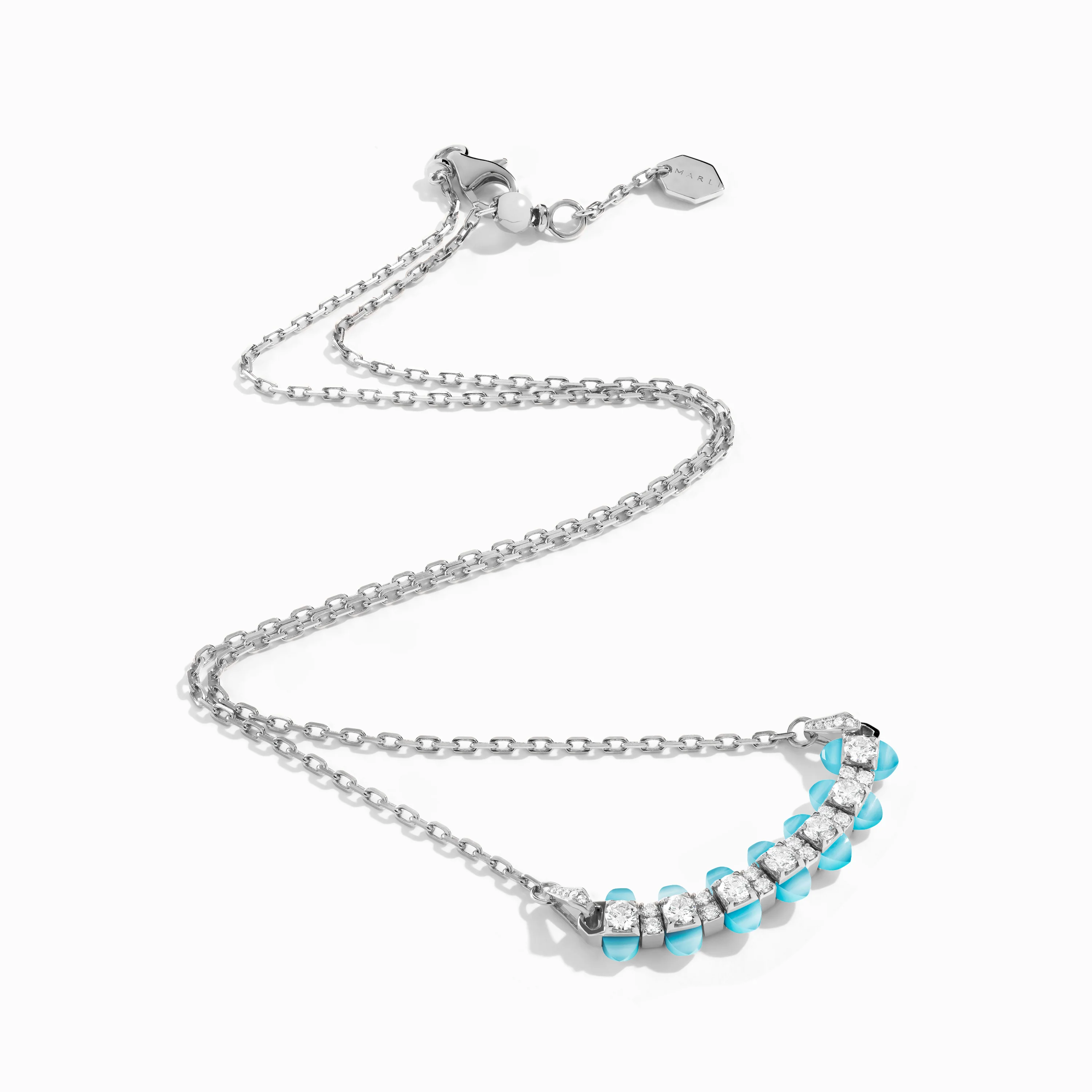 This stylish necklace features our Tip-Top design of diamonds with precious pyramid gemstones set adjacent to either side. Available in 18K white or rose gold and the gemstone of your choosing to bring out your own sense of style.